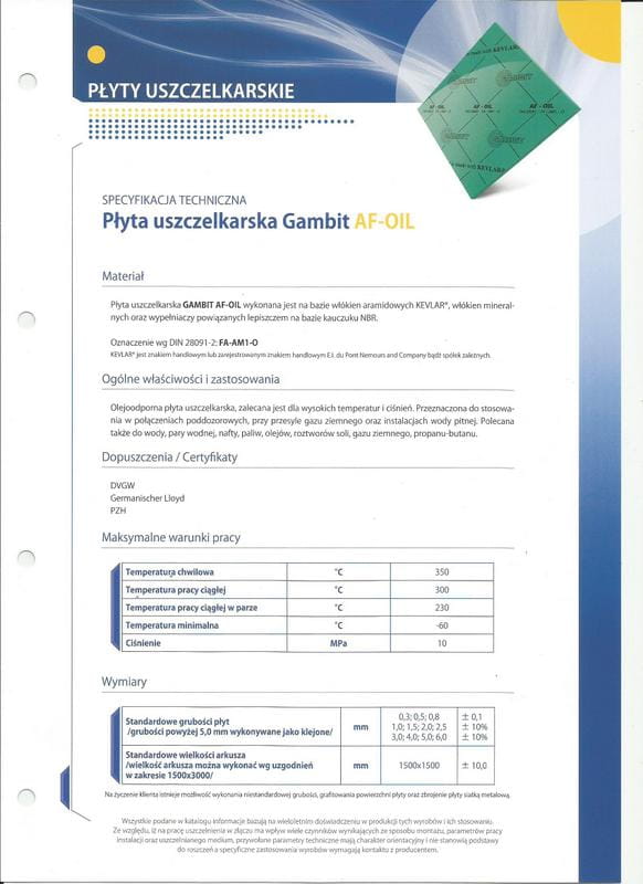Płyta uszczelkarska GAMBIT AF-OIL wykonana jest na bazie włókien aramidowych KEVLAR®, włókien mineralnych oraz wypełniaczy powiązanych lepiszczem na bazie kauczuku NBR.
