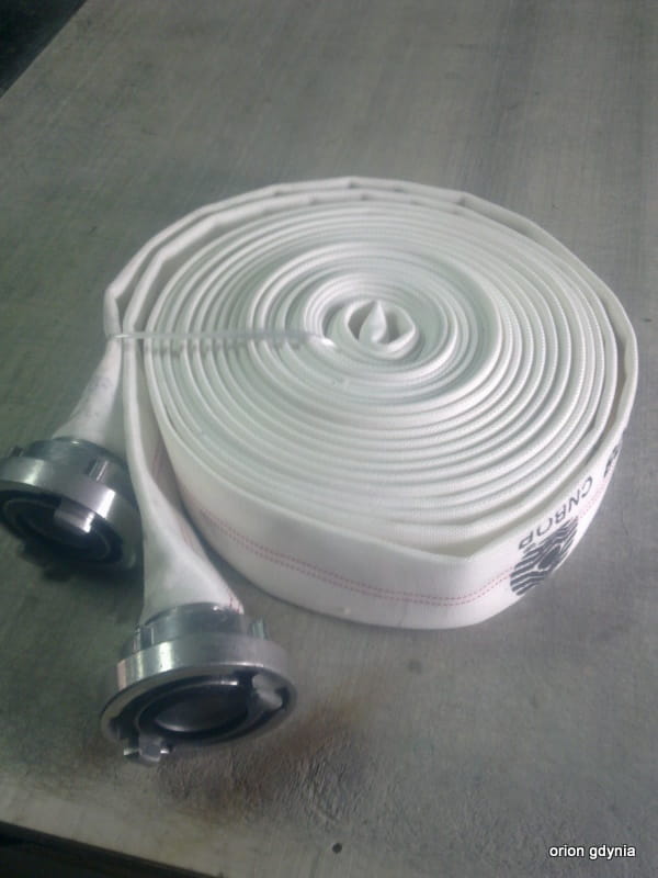 Wąż hydrantowy z łącznikami. Średnica wewnętrzna 52 mm , długość 20 mb , zakończony standardowymi łącznikami p.poż. typu STORZ