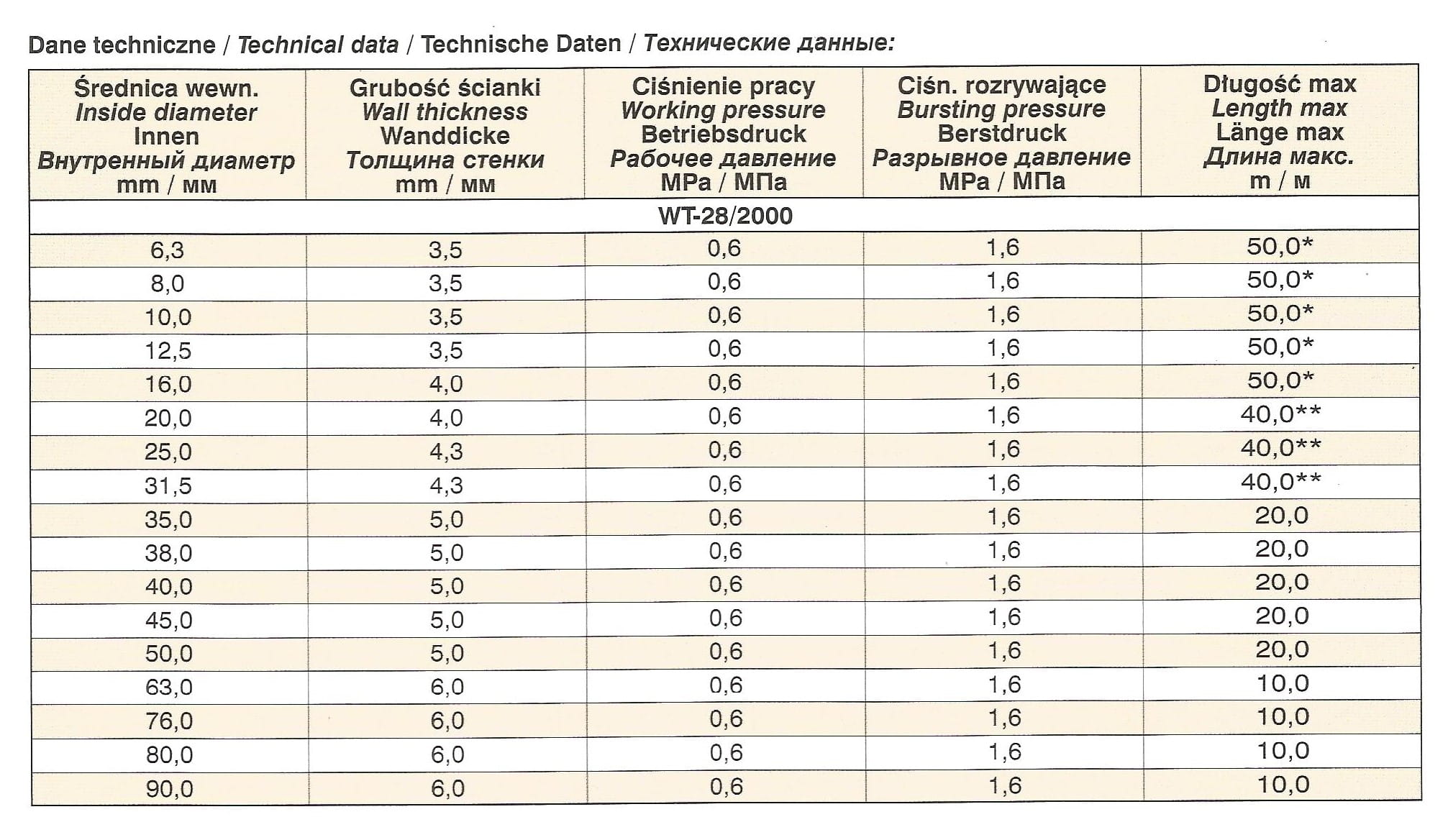 Ciśnienie robocze 0,6 MPa ; rozrywające 1,6 MPa